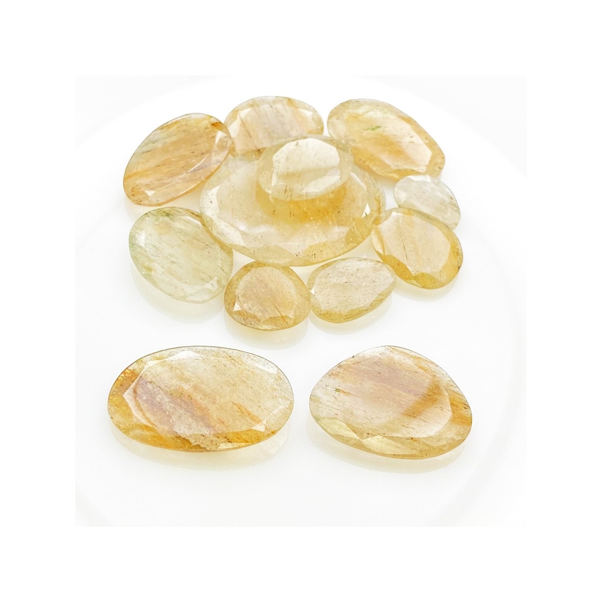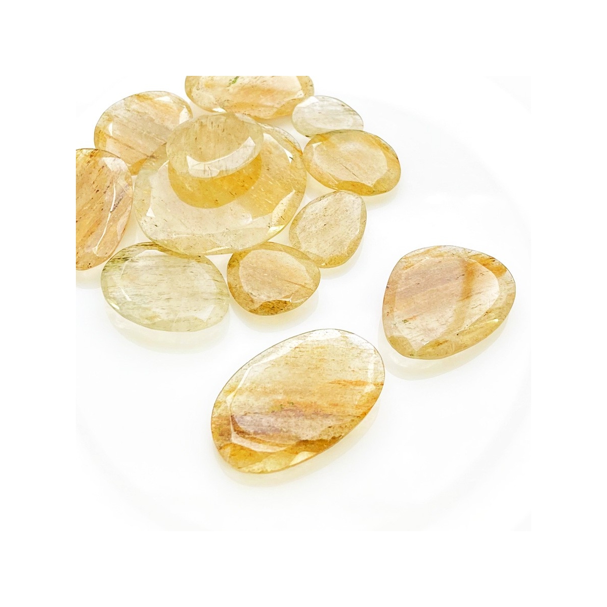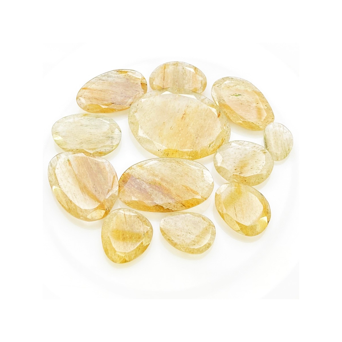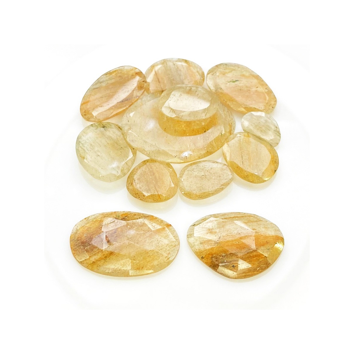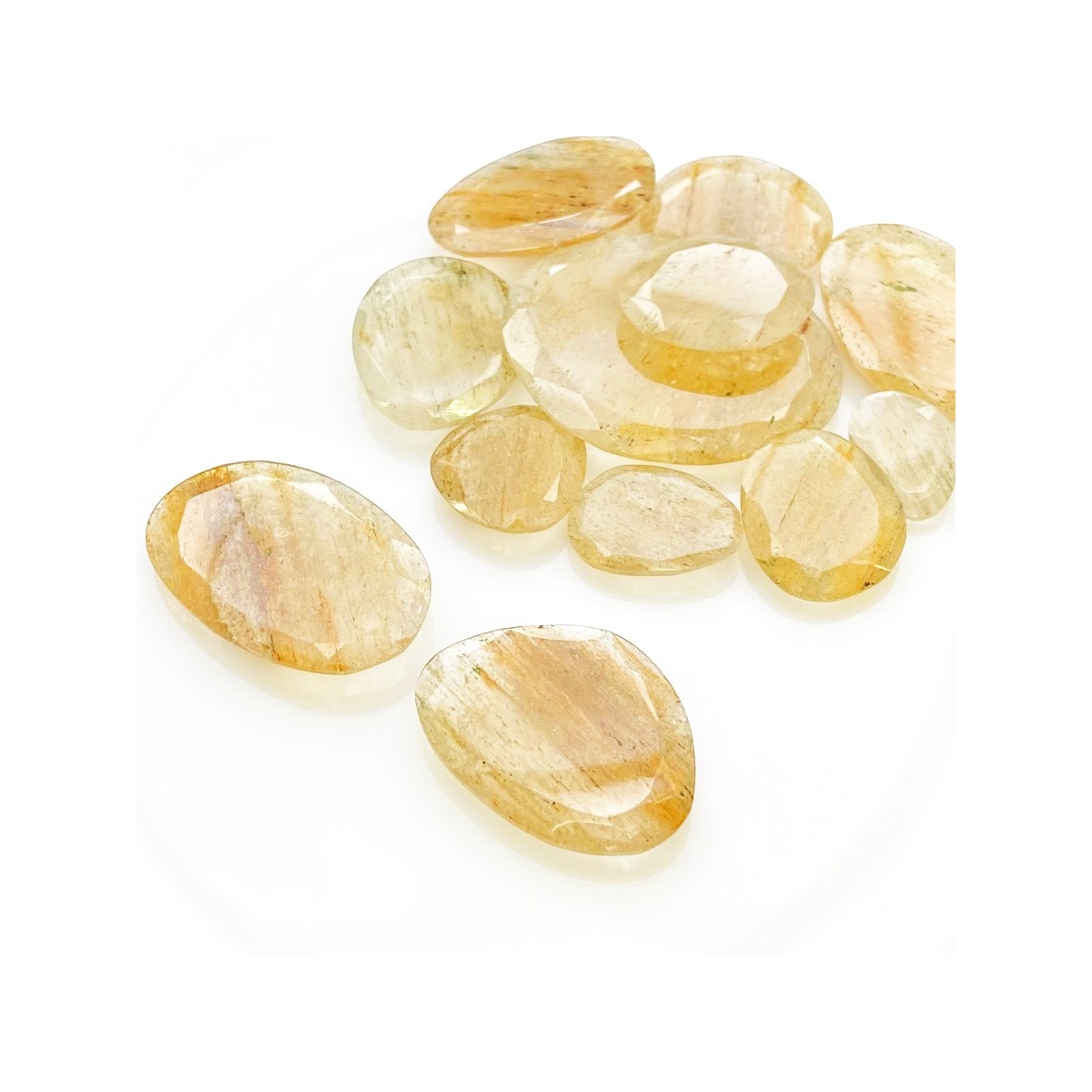 Buy This "AA" Grade 13.5-34mm Rose Cut Irregular Shape Natural Golden Rutile (Un-Treated) Gemstones Parcel. You Will Receive 12 Pcs. With a Total Weight of 130.3 Carat. This Golden Rutile Stone is Originated From Brazil and Masterfully Handcrafted by The Experienced Artisans of Jaipur (India).