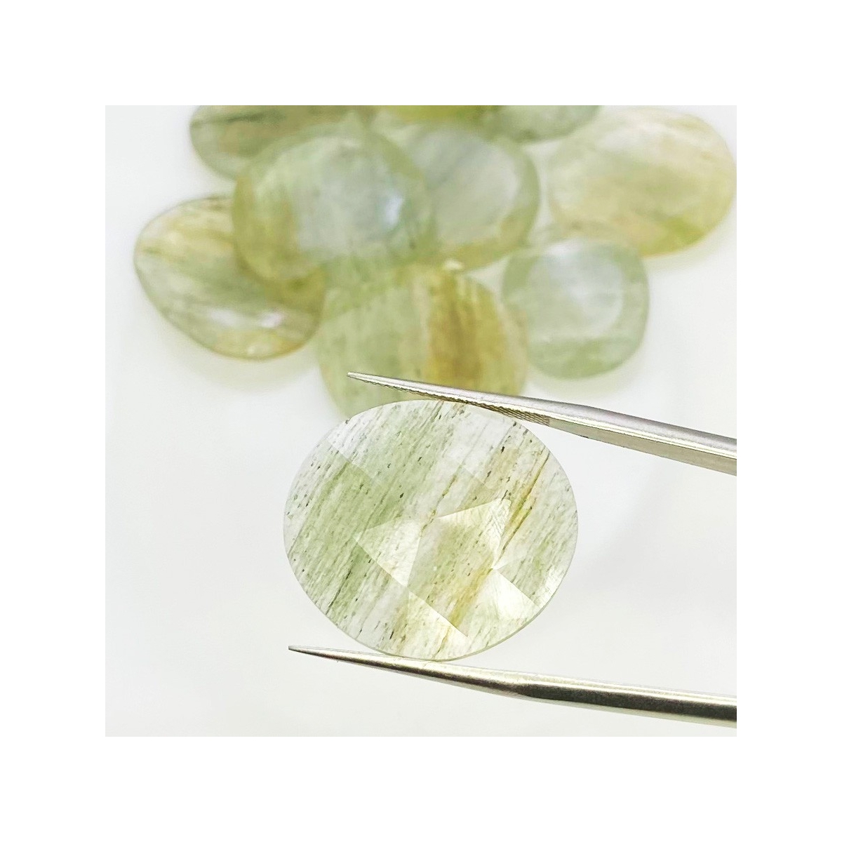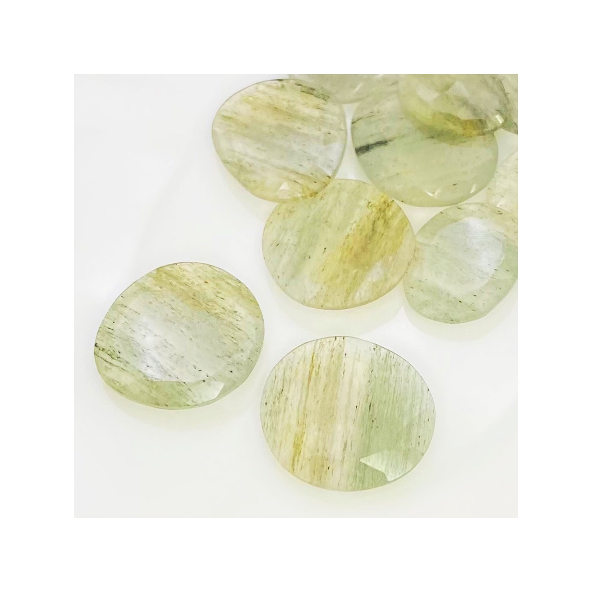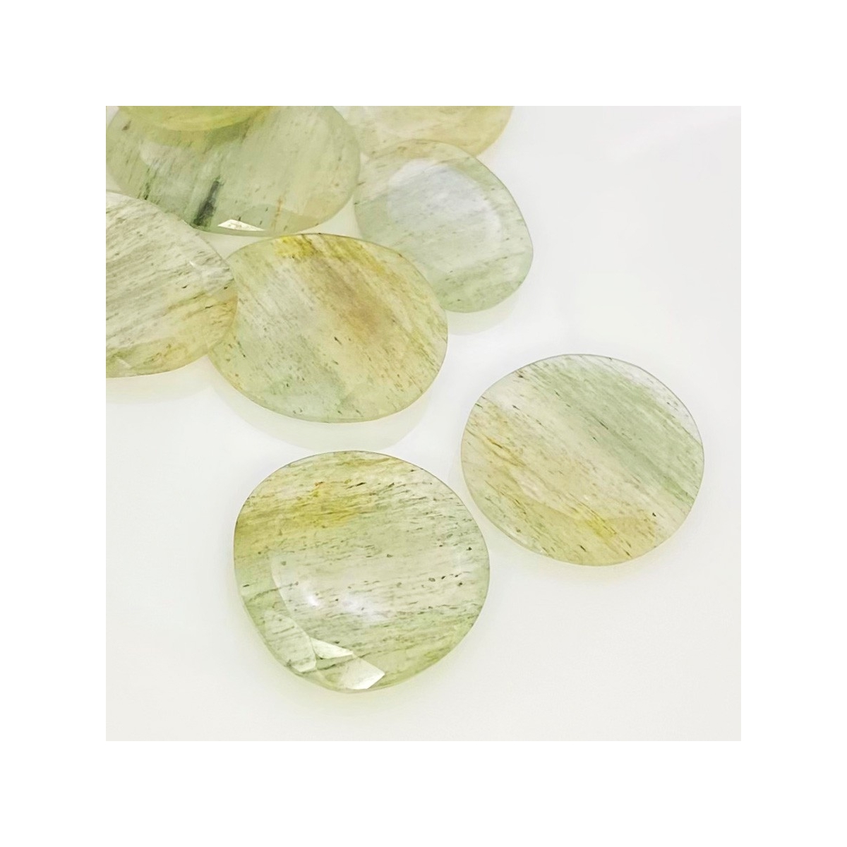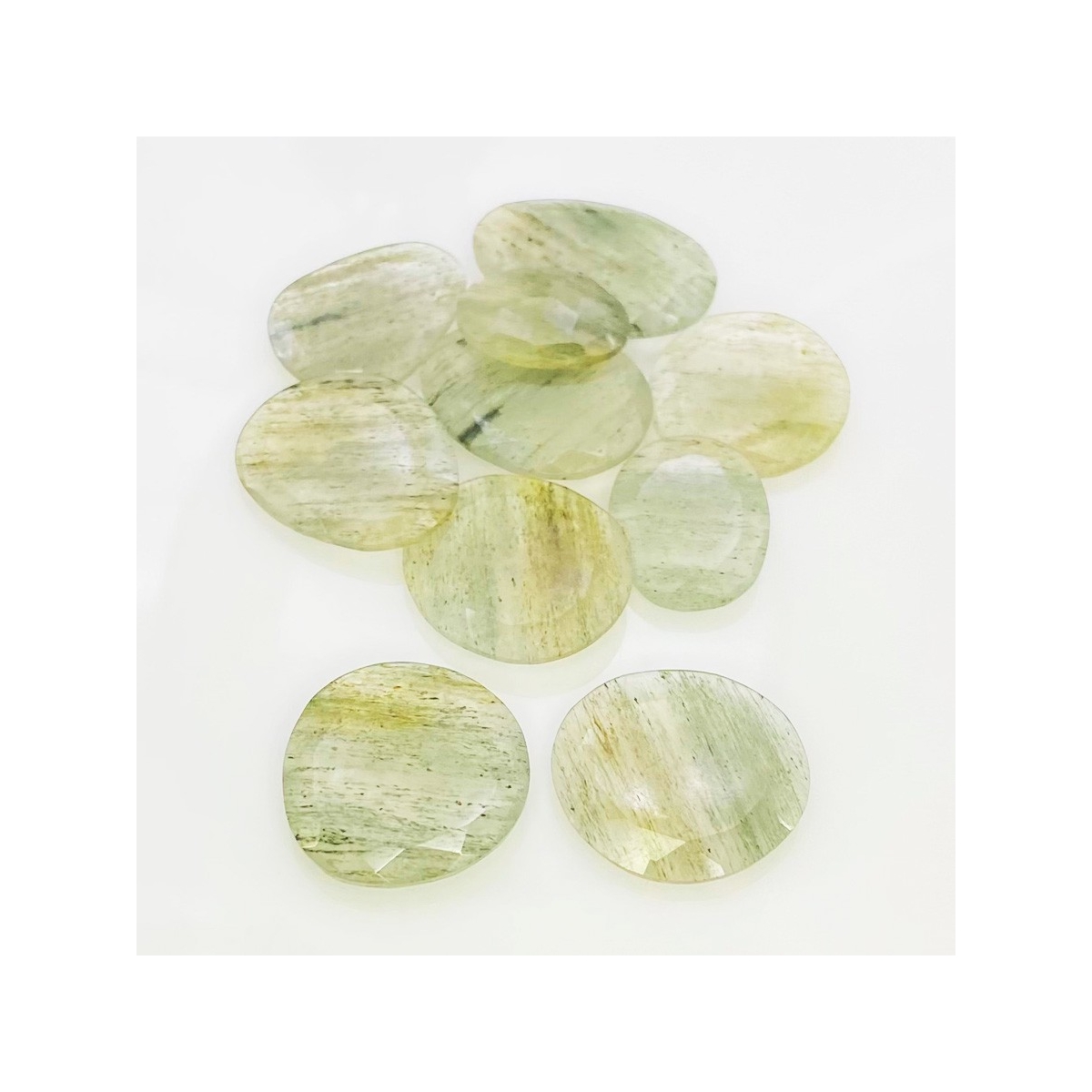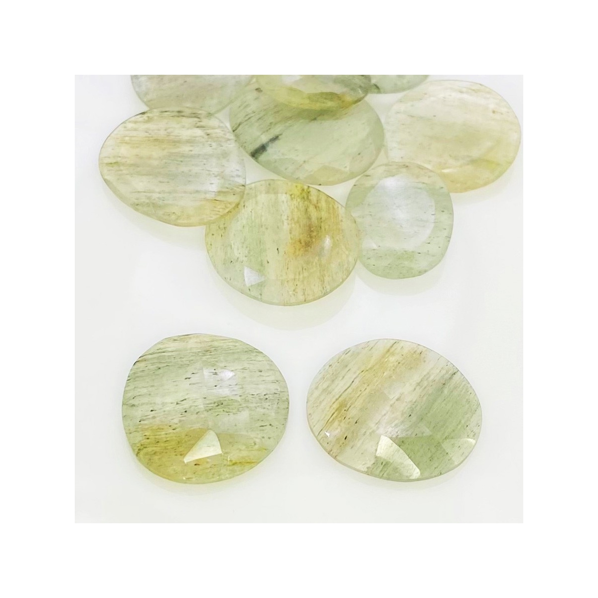 Buy This "AA" Grade 18-27mm Rose Cut Irregular Shape Natural Green Rutile (Un-Treated) Gemstones Parcel. You Will Receive 10 Pcs. With a Total Weight of 110.2 Carat. This Green Rutile Stone is Originated From Brazil and Masterfully Handcrafted by The Experienced Artisans of Jaipur (India).