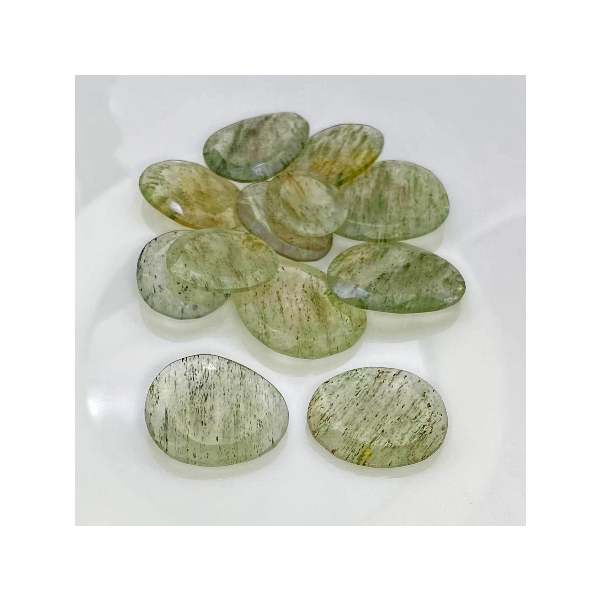 Buy This "AA" Grade 18.5-27mm Rose Cut Irregular Shape Natural Green Rutile (Un-Treated) Gemstones Parcel. You Will Receive 12 Pcs. With a Total Weight of 146.7 Carat. This Green Rutile Stone is Originated From Brazil and Masterfully Handcrafted by The Experienced Artisans of Jaipur (India).