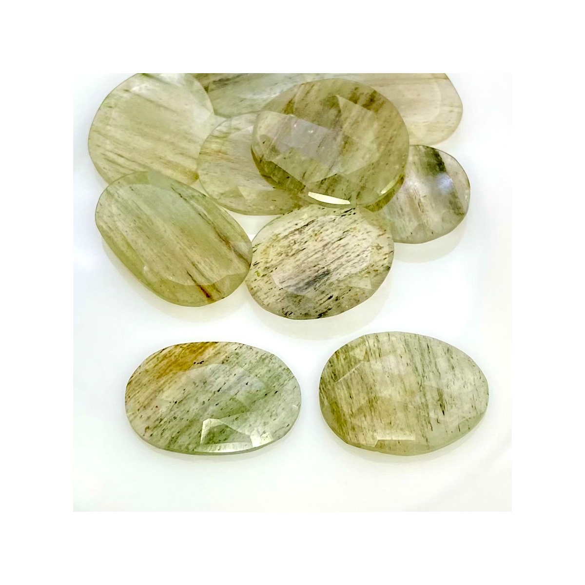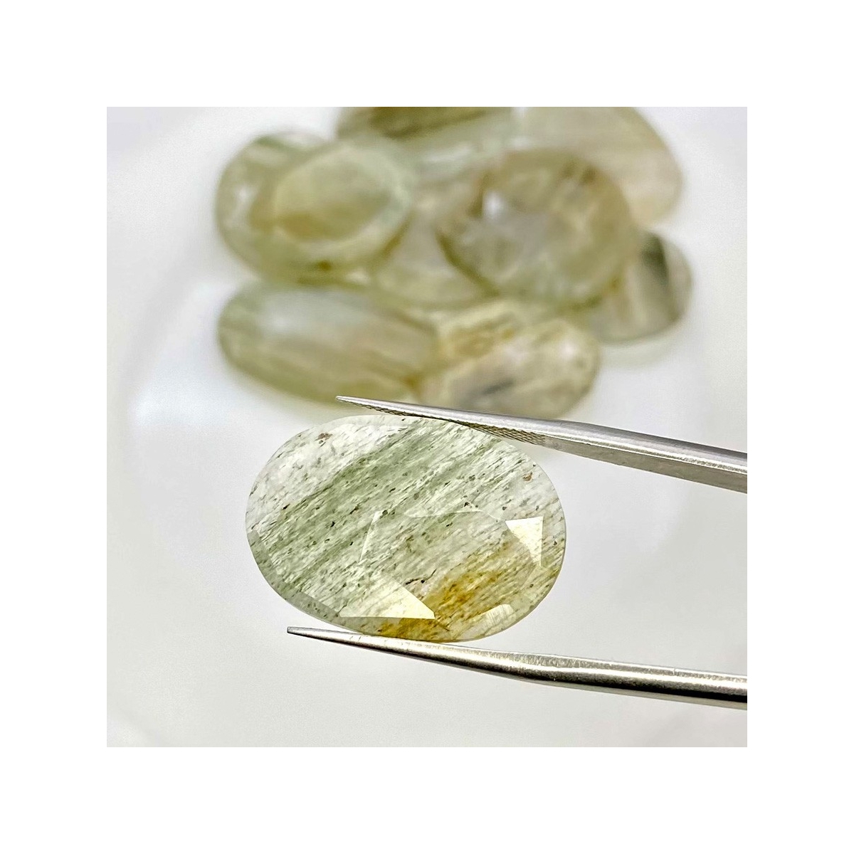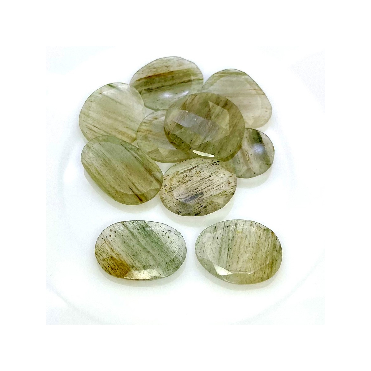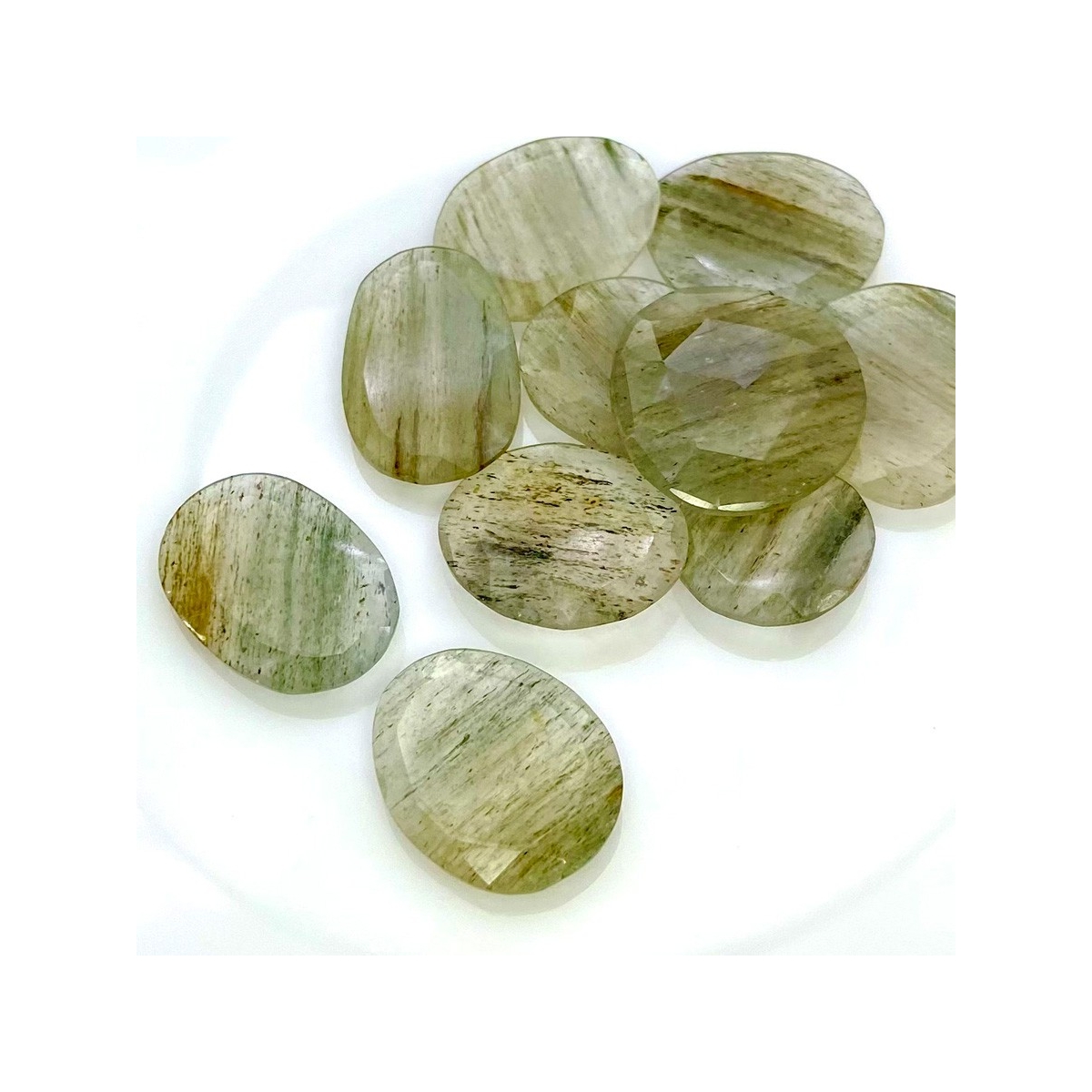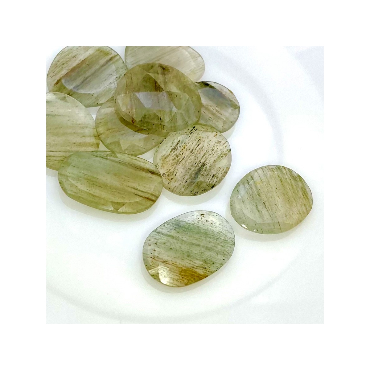 Buy This "AA" Grade 18-26mm Rose Cut Irregular Shape Natural Green Rutile (Un-Treated) Gemstones Parcel. You Will Receive 10 Pcs. With a Total Weight of 116.75 Carat. This Green Rutile Stone is Originated From Brazil and Masterfully Handcrafted by The Experienced Artisans of Jaipur (India).