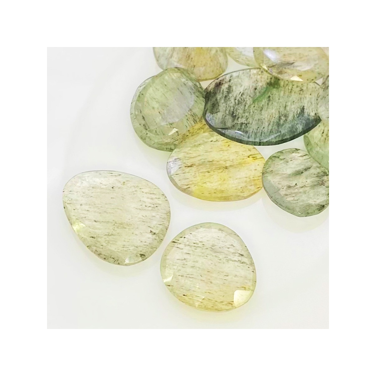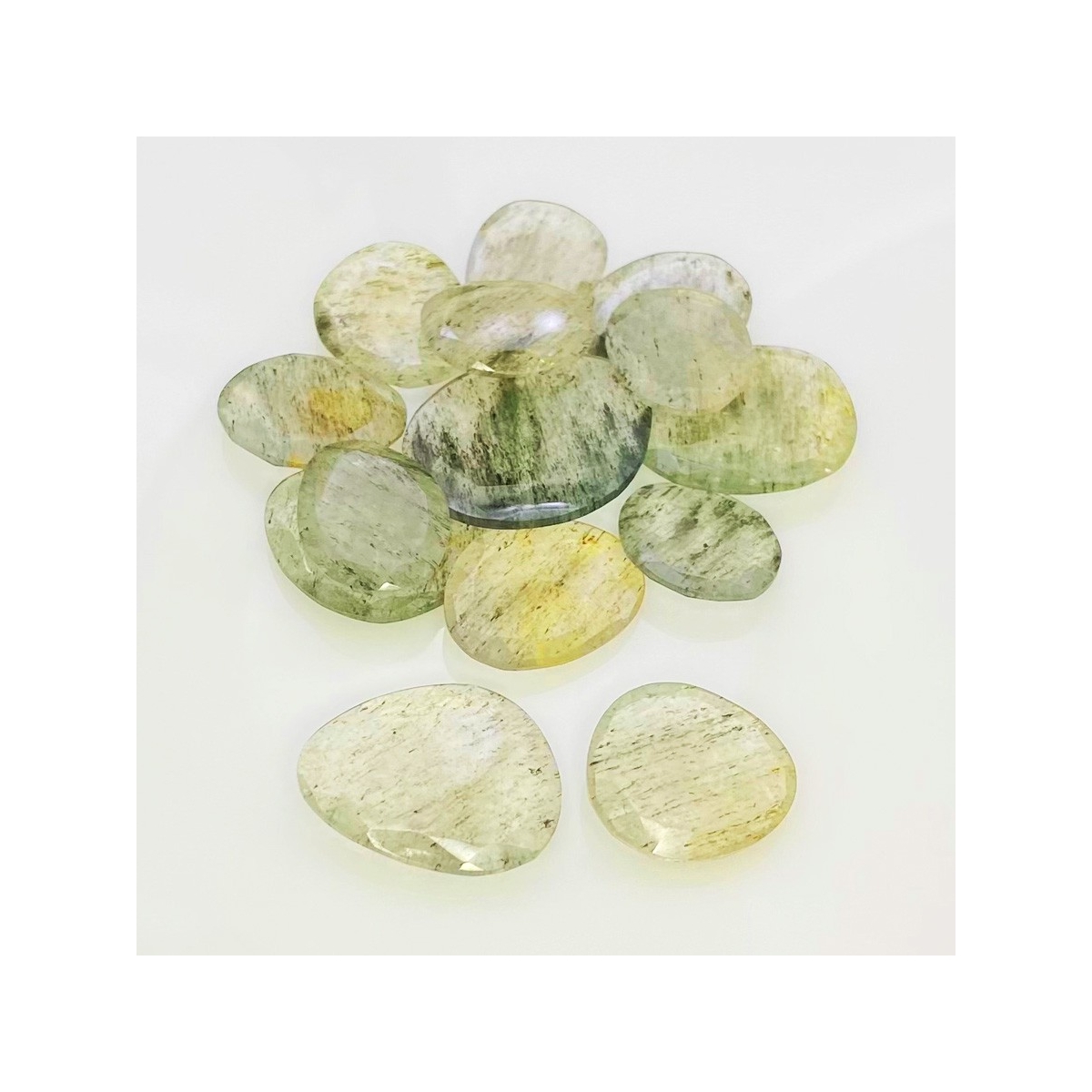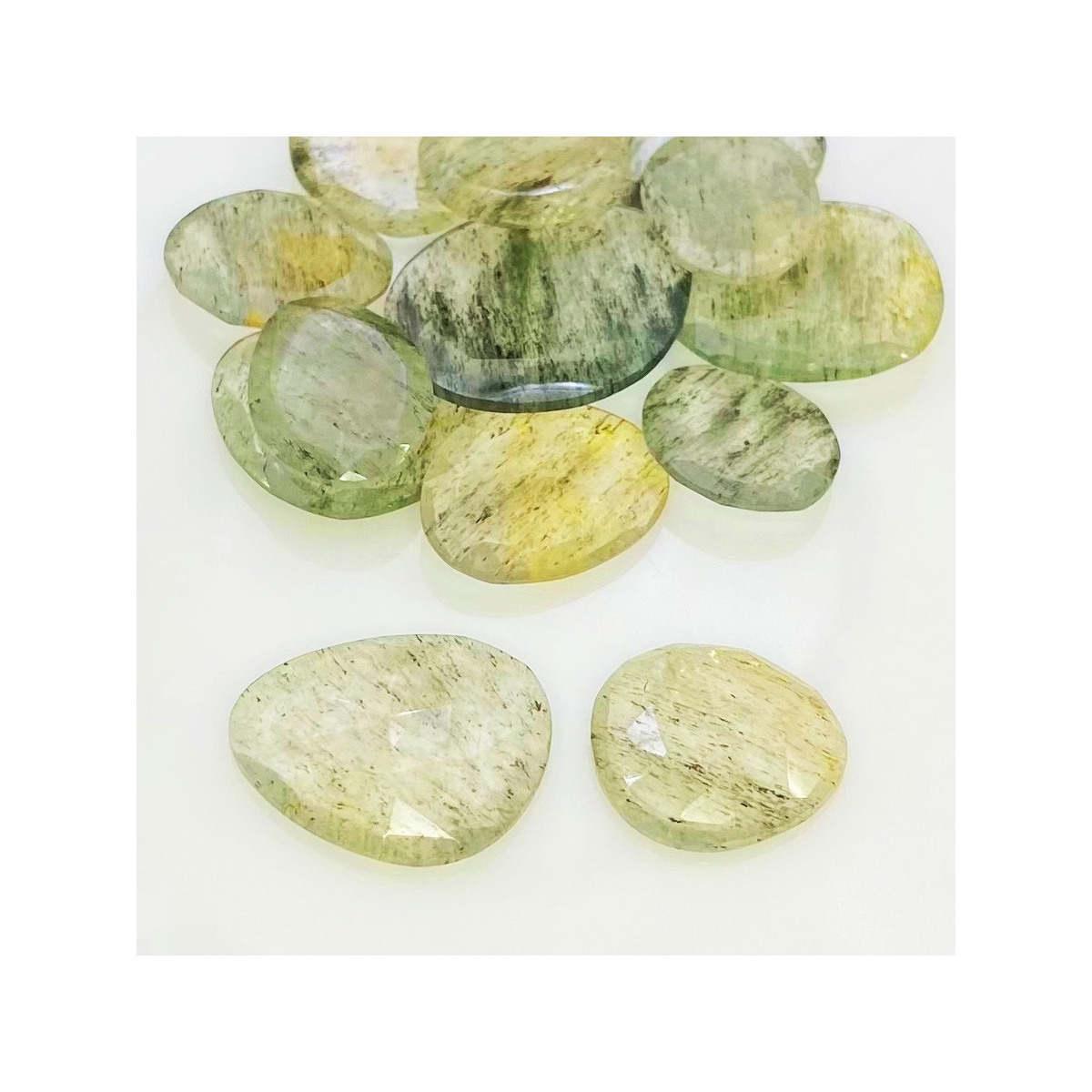 Buy This "AA" Grade 16-26mm Rose Cut Irregular Shape Natural Green Rutile (Un-Treated) Gemstones Parcel. You Will Receive 14 Pcs. With a Total Weight of 112.2 Carat. This Green Rutile Stone is Originated From Brazil and Masterfully Handcrafted by The Experienced Artisans of Jaipur (India).
