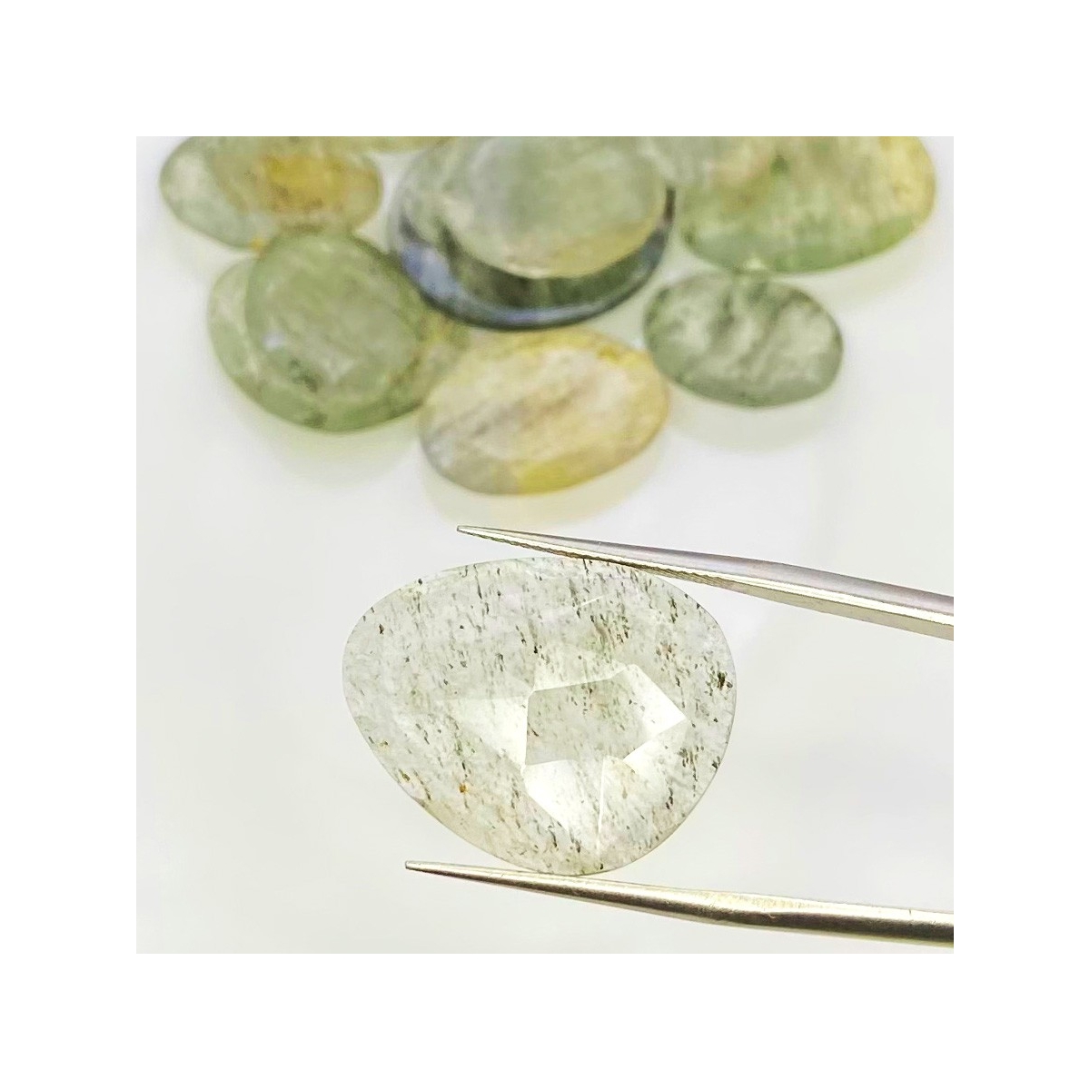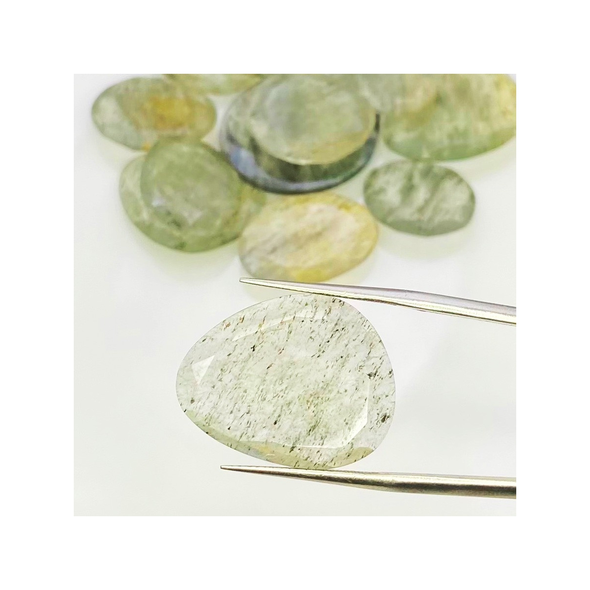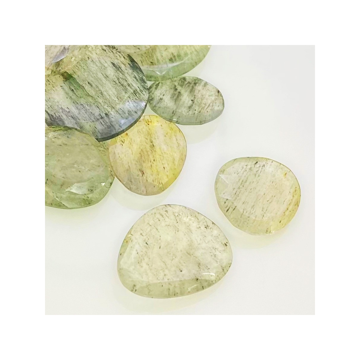 Buy This "AA" Grade 16-26mm Rose Cut Irregular Shape Natural Green Rutile (Un-Treated) Gemstones Parcel. You Will Receive 14 Pcs. With a Total Weight of 112.2 Carat. This Green Rutile Stone is Originated From Brazil and Masterfully Handcrafted by The Experienced Artisans of Jaipur (India).