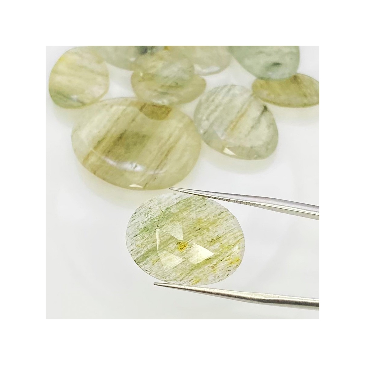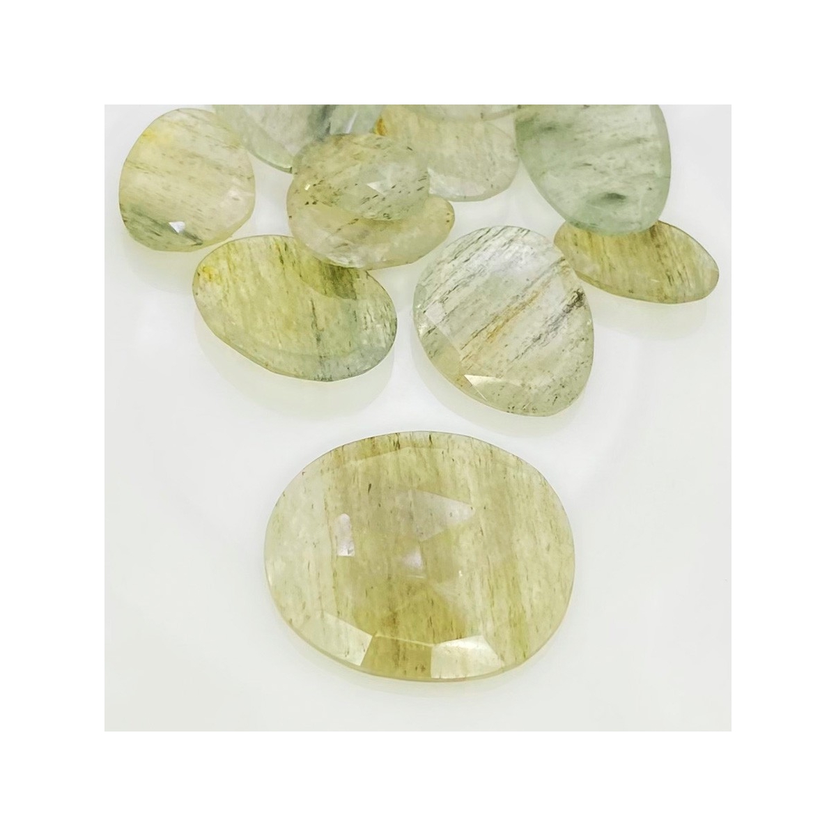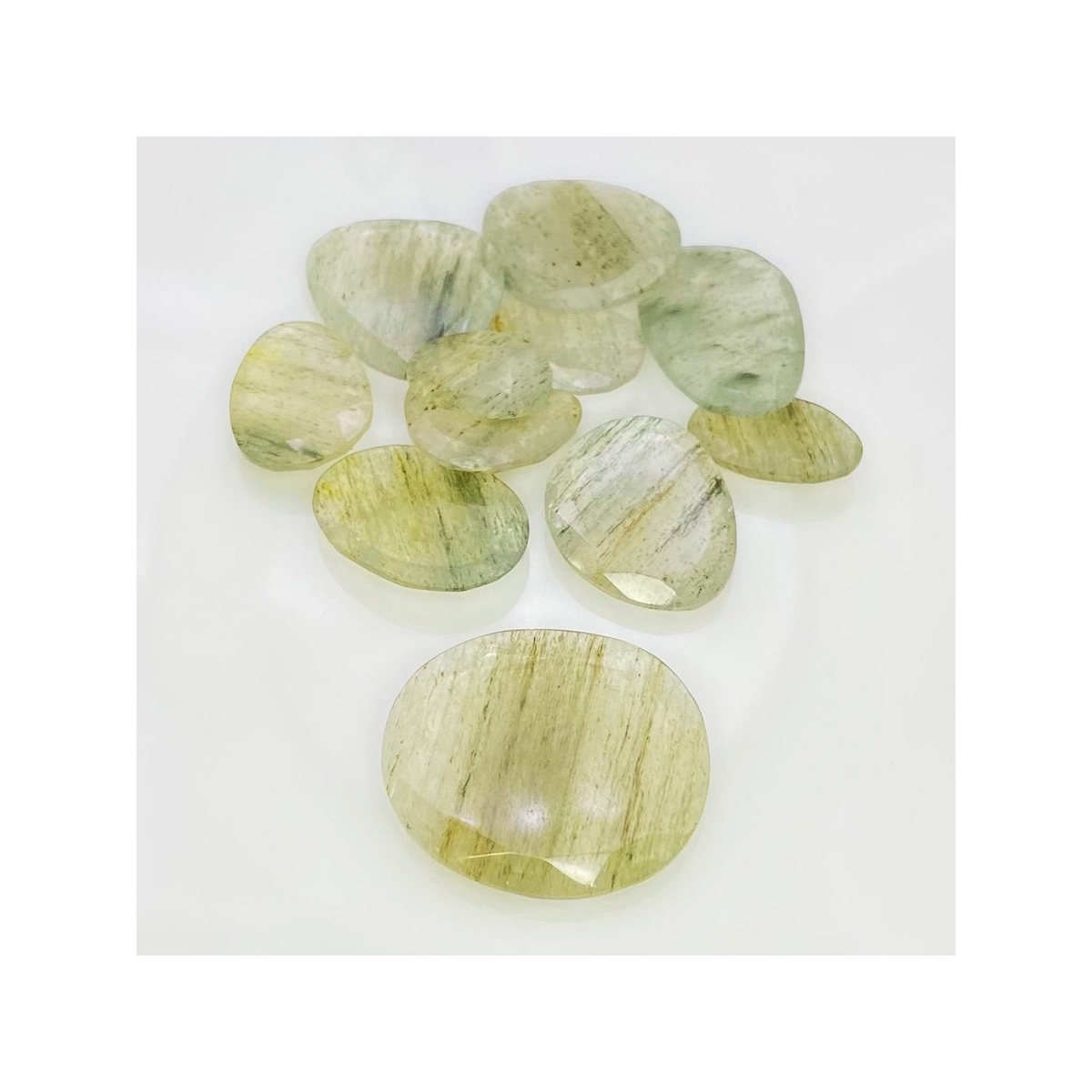 Buy This "AA" Grade 14-27mm Rose Cut Irregular Shape Natural Green Rutile (Un-Treated) Gemstones Parcel. You Will Receive 11 Pcs. With a Total Weight of 100.95 Carat. This Green Rutile Stone is Originated From Brazil and Masterfully Handcrafted by The Experienced Artisans of Jaipur (India).
