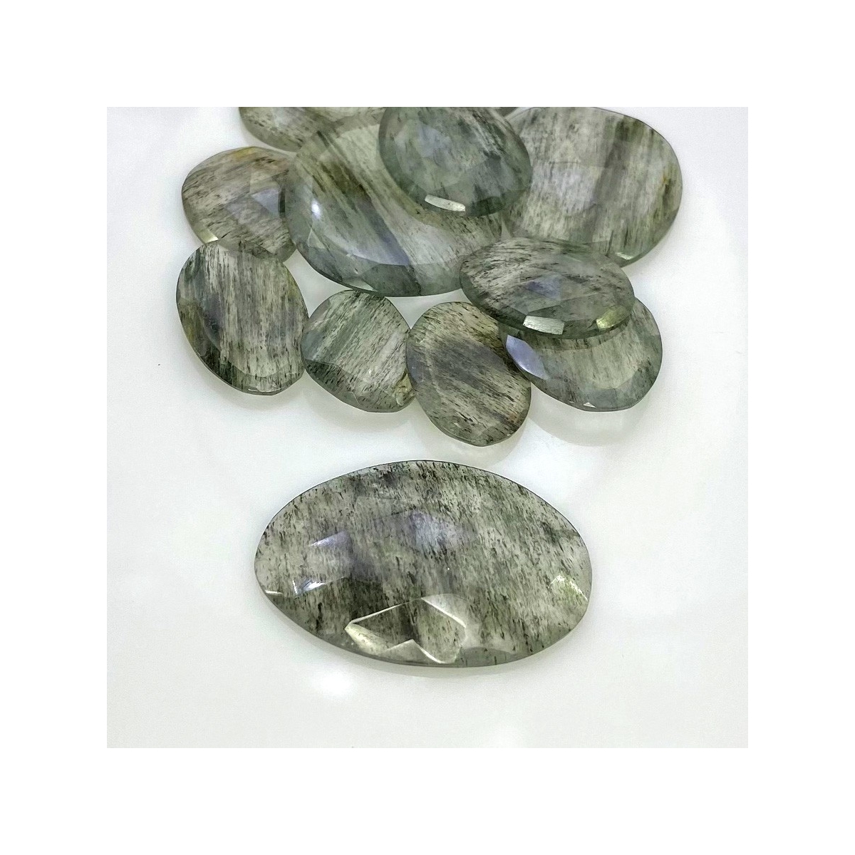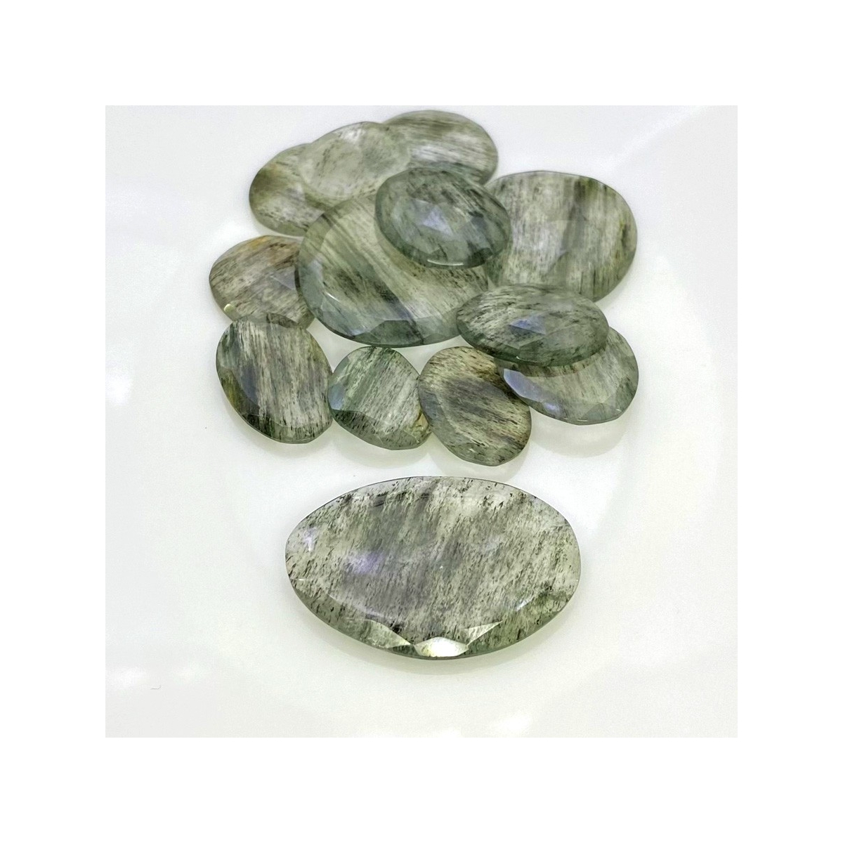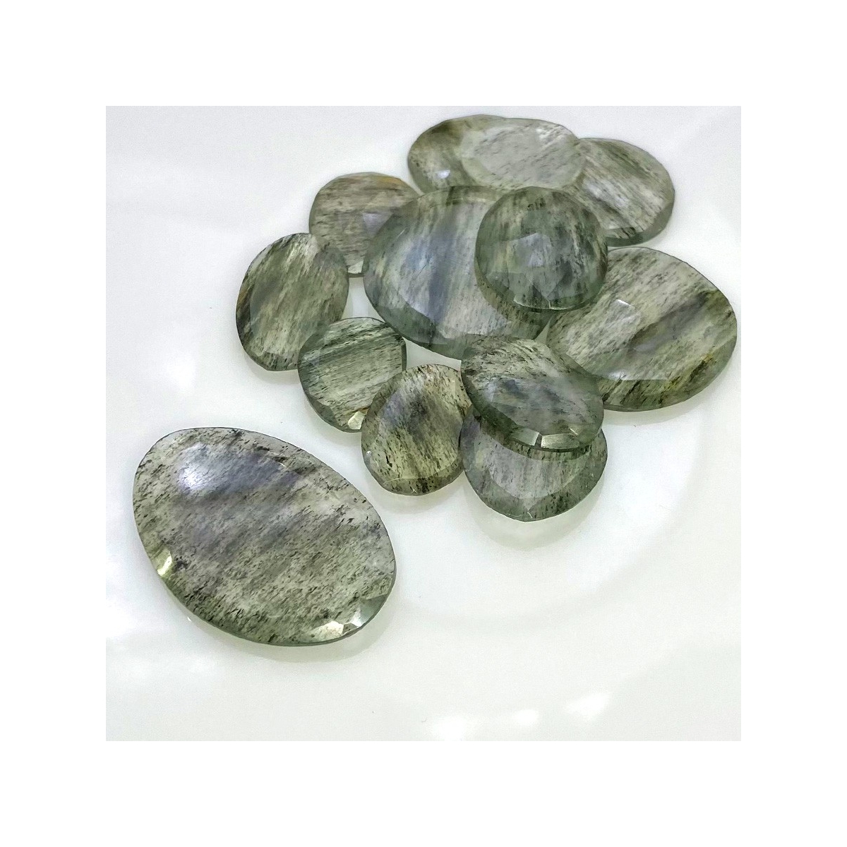 Buy This "AA" Grade 15.5-34mm Rose Cut Irregular Shape Natural Green Rutile (Un-Treated) Gemstones Parcel. You Will Receive 13 Pcs. With a Total Weight of 134 Carat. This Green Rutile Stone is Originated From Brazil and Masterfully Handcrafted by The Experienced Artisans of Jaipur (India).