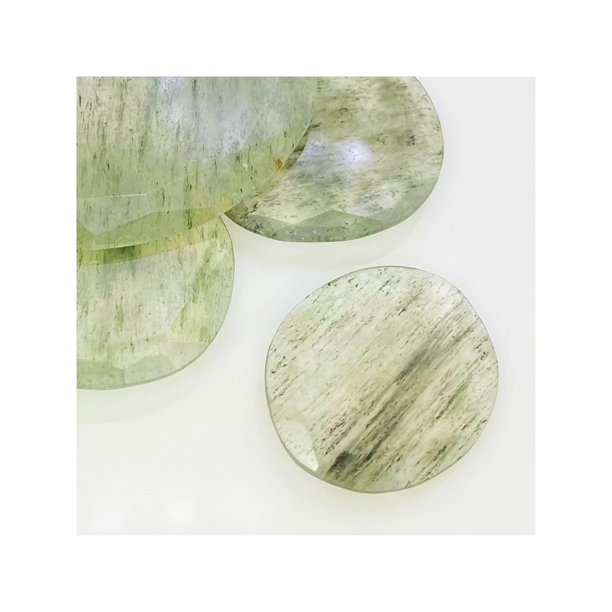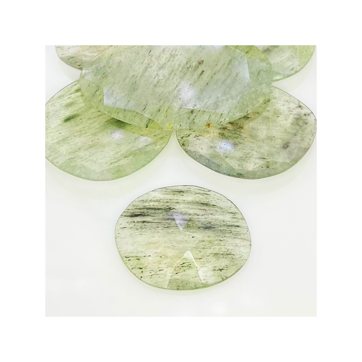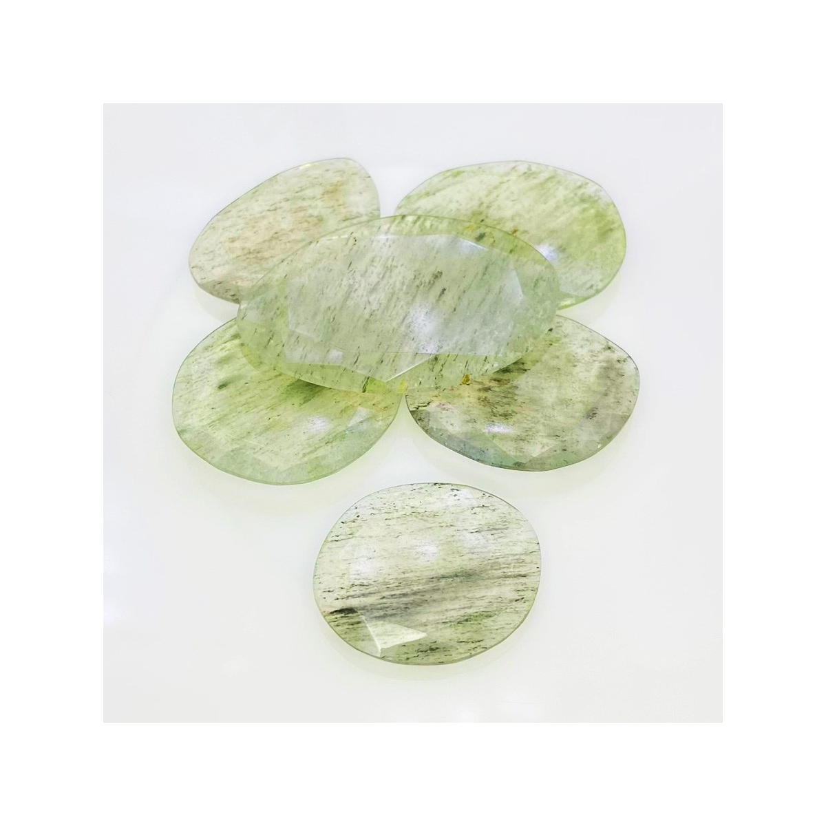 Buy This "AA" Grade 27-43mm Rose Cut Irregular Shape Natural Green Rutile (Un-Treated) Gemstones Parcel. You Will Receive 6 Pcs. With a Total Weight of 148.3 Carat. This Green Rutile Stone is Originated From Brazil and Masterfully Handcrafted by The Experienced Artisans of Jaipur (India).