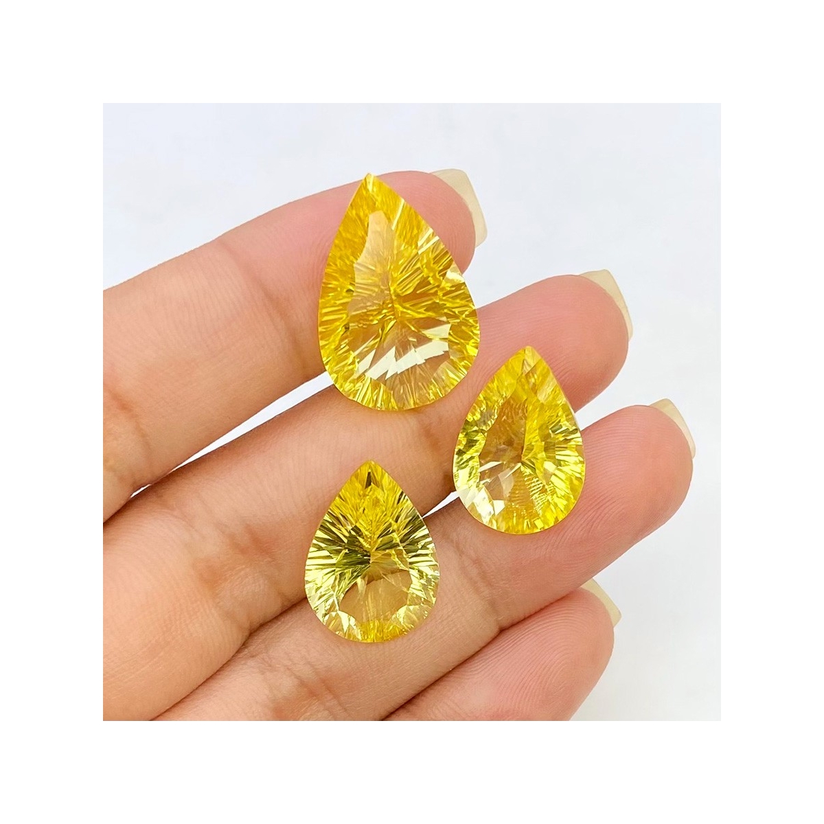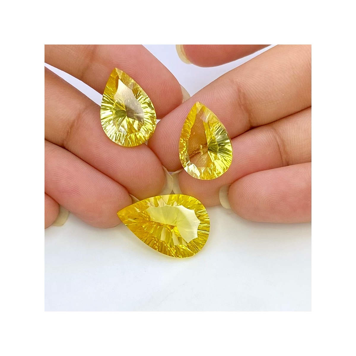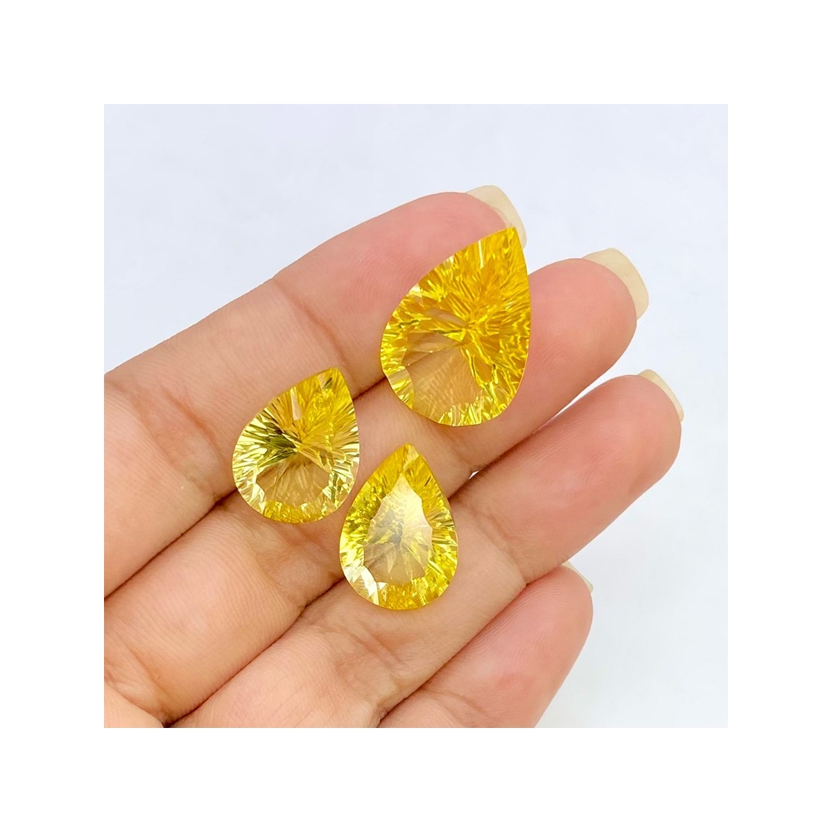 Buy This "AAA" Grade 20x14-17x12mm Concave Cut Pear Shape Created Lab Yellow Sapphire (Lab Grown) Matched Gemstones Set. You Will Receive 3 Pcs. With a Total Weight of 35.45 Cts.. This Lab Yellow Sapphire Stone is Originated From Russia and Masterfully Handcrafted by The Experienced Artisans of Jaipur (India).