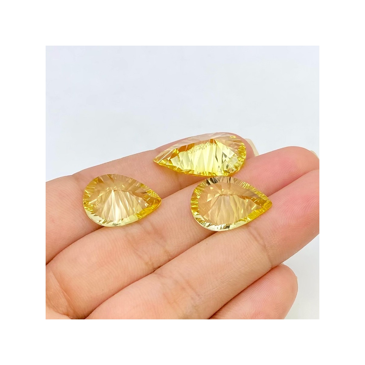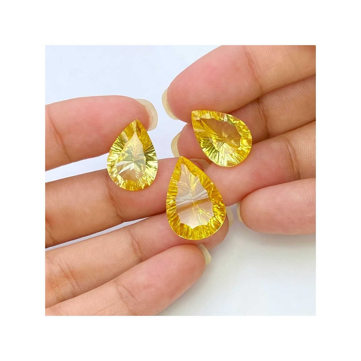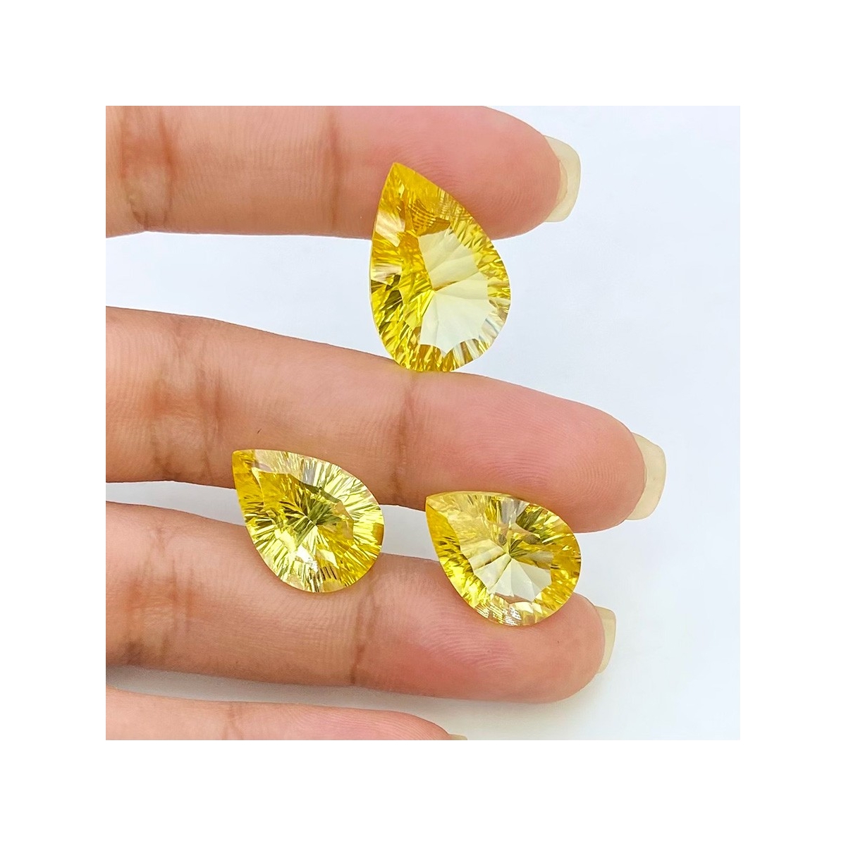 Buy This "AAA" Grade 20x14-17x12mm Concave Cut Pear Shape Created Lab Yellow Sapphire (Lab Grown) Matched Gemstones Set. You Will Receive 3 Pcs. With a Total Weight of 35.45 Cts.. This Lab Yellow Sapphire Stone is Originated From Russia and Masterfully Handcrafted by The Experienced Artisans of Jaipur (India).