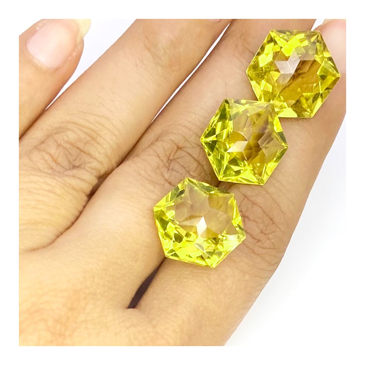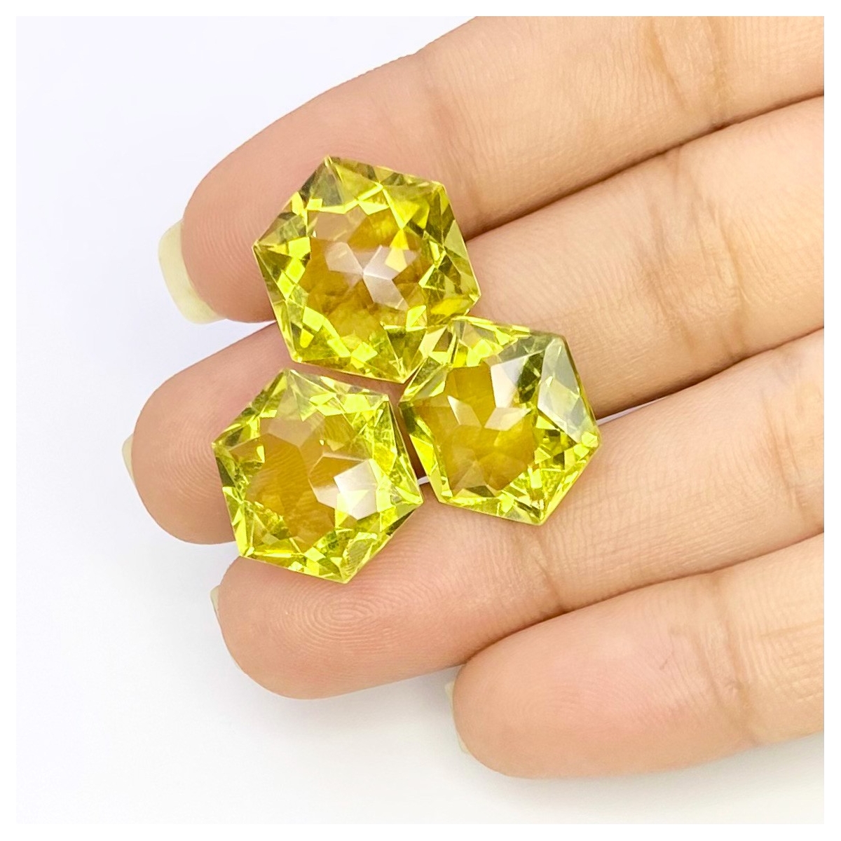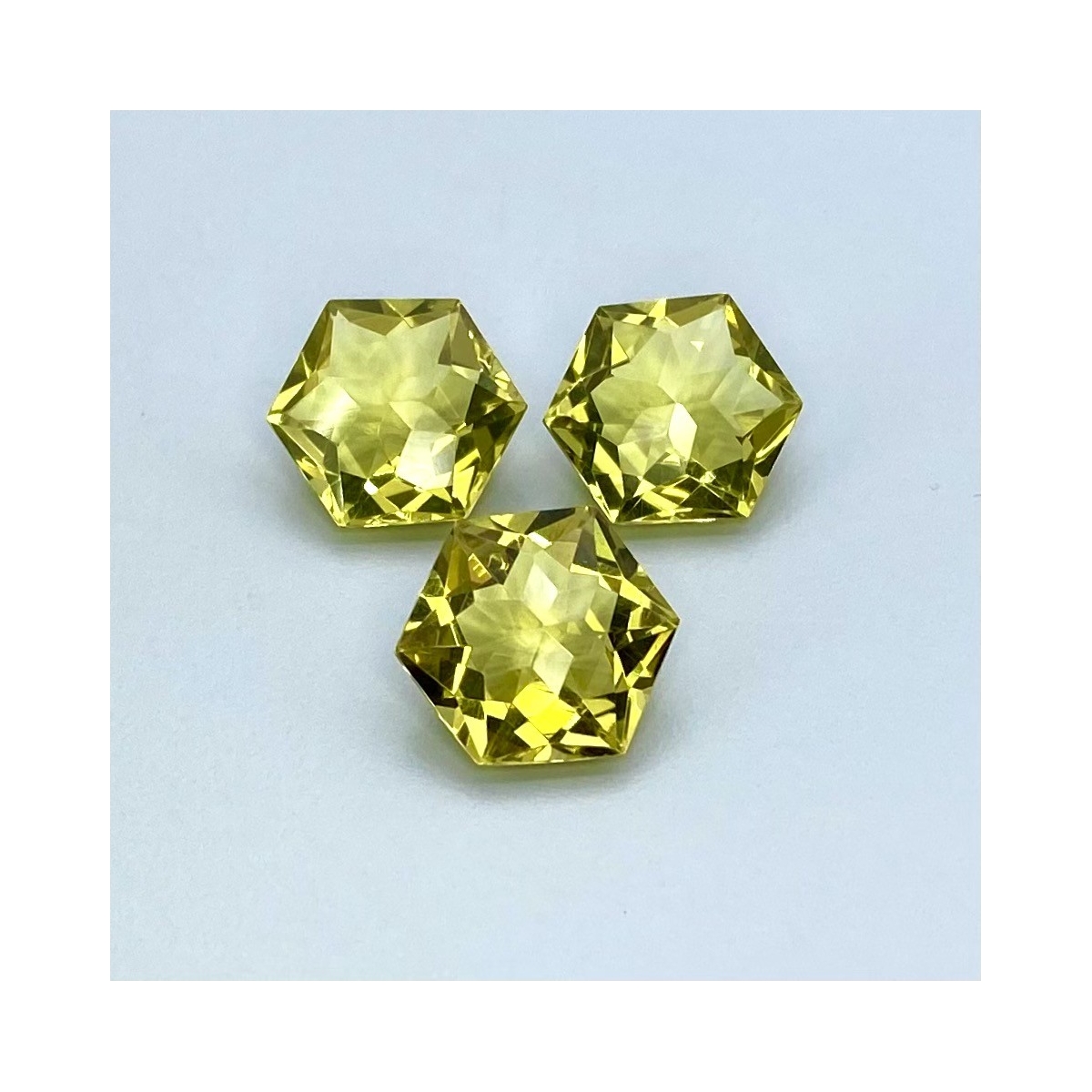 Buy This "AAA" Grade 14-14.5mm Fancy Cut Hexagon Shape Natural Lemon Quartz (Heated) Matched Gemstones Set. You Will Receive 3 Pcs. With a Total Weight of 30.30 Cts.. This Lemon Quartz Stone is Originated From Brazil and Masterfully Handcrafted by The Experienced Artisans of Jaipur (India).