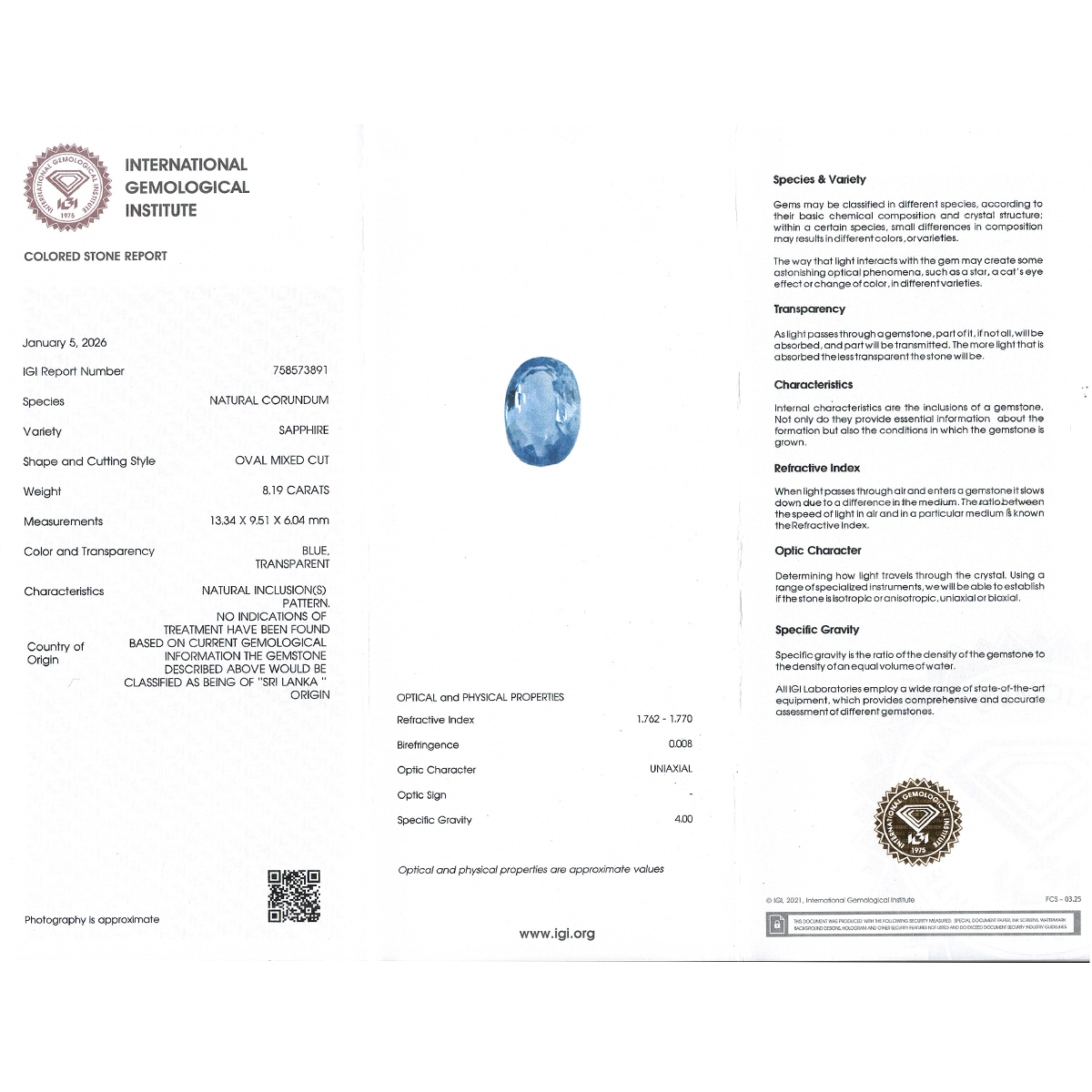 Buy This "A+" Grade 13.34x9.51x6.04mm Faceted Oval Shape Natural Blue Sapphire (Un-Treated) Loose Gemstone. You Will Receive 1 Pc. With a Total Weight of 8.19 Cts.. This Blue Sapphire Stone is Originated From Sri Lanka and Masterfully Handcrafted by The Experienced Artisans of Jaipur (India).
