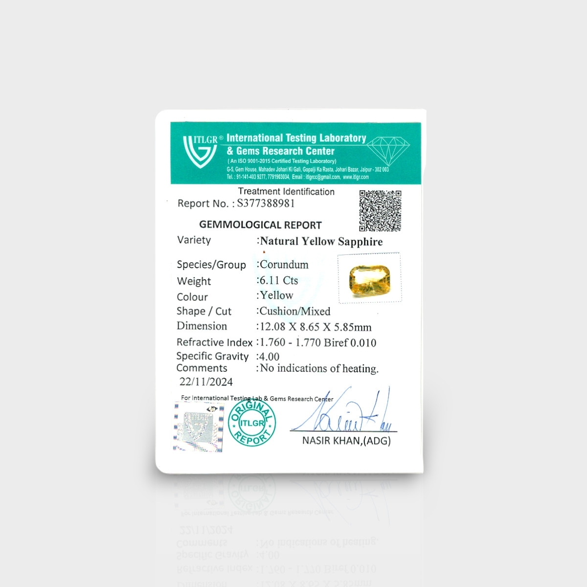 6.11 Cts. Yellow Sapphire 12.04X8.60X5.80mm Faceted Cushion Shape AA+ Grade Loose Gemstone - Total 1 Pc.