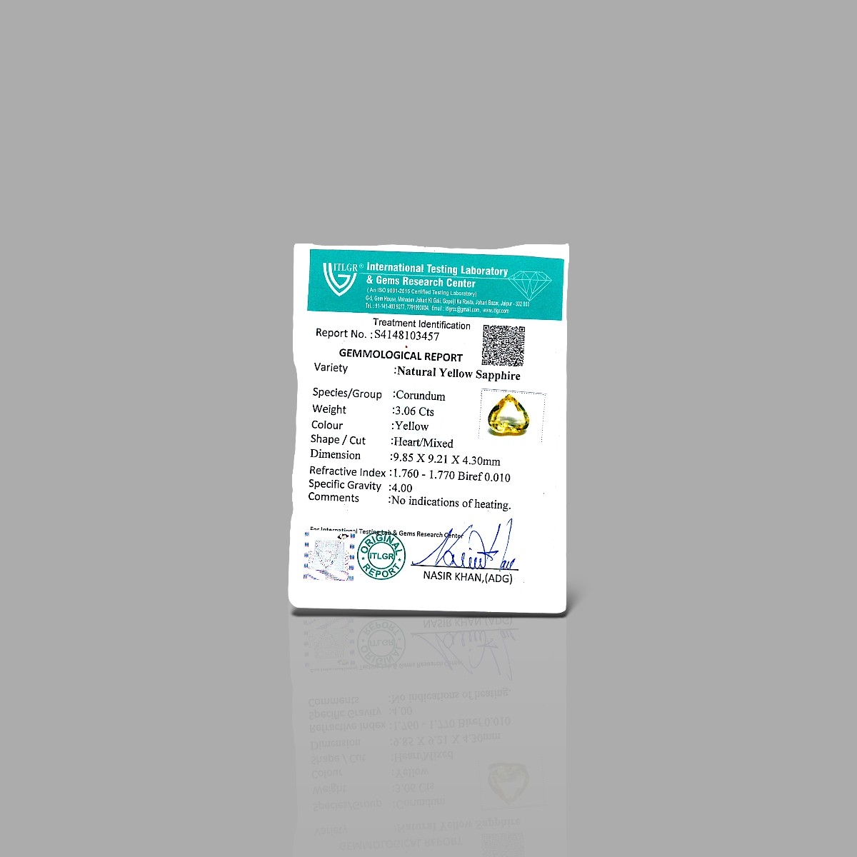 Buy This "AA+" Grade 9.85x9.21x4.30mm Faceted Heart Shape Natural Yellow Sapphire (Un-Treated) Loose Gemstone. You Will Receive 1 Pc. With a Total Weight of 3.06 Cts.. This Yellow Sapphire Stone is Originated From Sri Lanka and Masterfully Handcrafted by The Experienced Artisans of Jaipur (India).