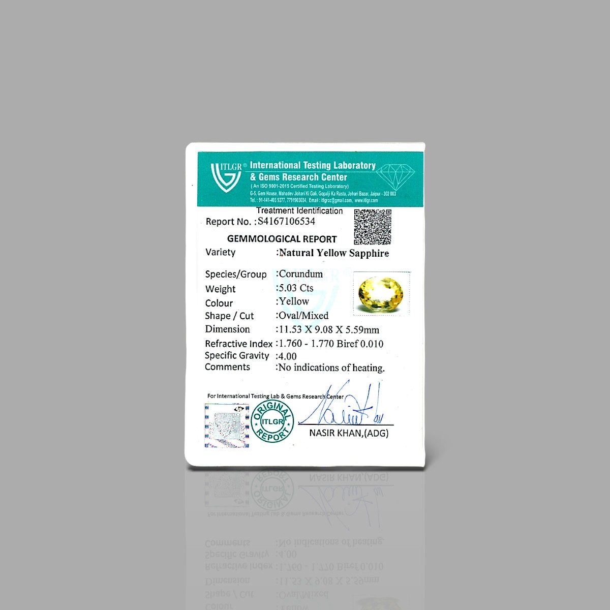 Buy This "AA" Grade 11.53x9.08x5.59mm Faceted Oval Shape Natural Yellow Sapphire (Un-Treated) Loose Gemstone. You Will Receive 1 Pc. With a Total Weight of 5.03 Cts.. This Yellow Sapphire Stone is Originated From Sri Lanka and Masterfully Handcrafted by The Experienced Artisans of Jaipur (India).