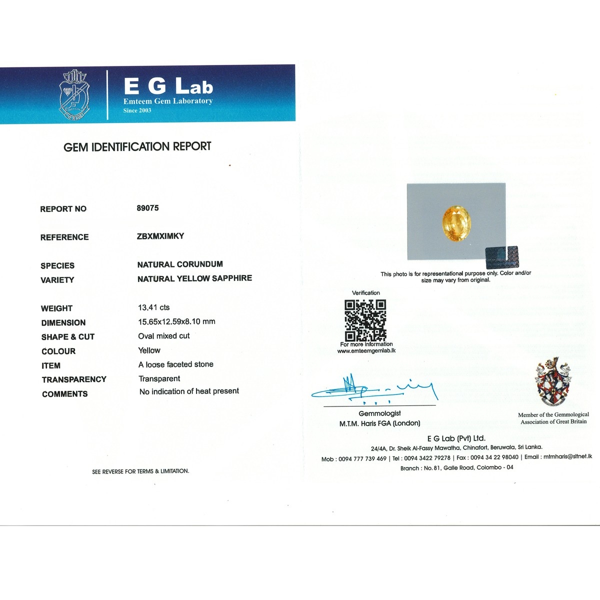 Buy This "AAA" Grade 15.65x12.59x8.10mm Faceted Oval Shape Natural Yellow Sapphire (Un-Treated) Loose Gemstone. You Will Receive 1 Pc. With a Total Weight of 13.41 Cts.. This Yellow Sapphire Stone is Originated From Sri Lanka and Masterfully Handcrafted by The Experienced Artisans of Jaipur (India).