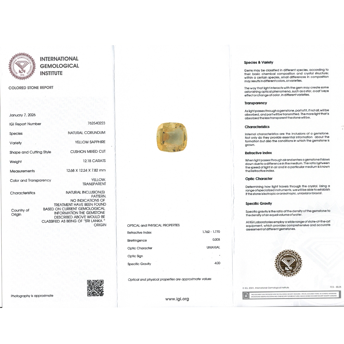 Buy This "AAA" Grade 12.69x12.25x7.80mm Faceted Square Cushion Shape Natural Yellow Sapphire (Un-Treated) Loose Gemstone. You Will Receive 1 Pc. With a Total Weight of 12.18 Cts.. This Yellow Sapphire Stone is Originated From Sri Lanka and Masterfully Handcrafted by The Experienced Artisans of Jaipur (India).
