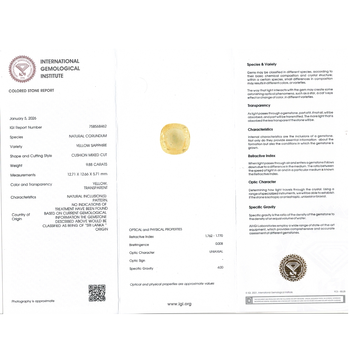 Buy This "AA" Grade 12.71x12.66x5.71mm Faceted Square Cushion Shape Natural Yellow Sapphire (Un-Treated) Loose Gemstone. You Will Receive 1 Pc. With a Total Weight of 9.88 Cts.. This Yellow Sapphire Stone is Originated From Sri Lanka and Masterfully Handcrafted by The Experienced Artisans of Jaipur (India).