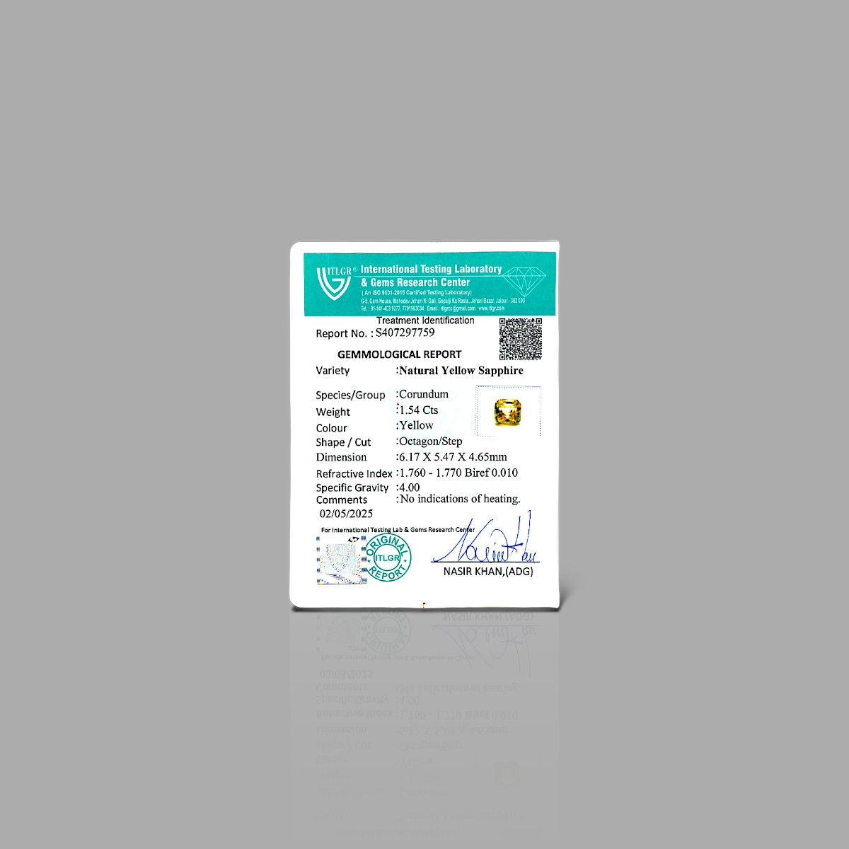 Buy This "AA+" Grade 6.13x5.45x4.60mm Step Cut Octagon Shape Natural Yellow Sapphire (Un-Treated) Loose Gemstone. You Will Receive 1 Pc. With a Total Weight of 1.54 Cts.. This Yellow Sapphire Stone is Originated From Sri Lanka and Masterfully Handcrafted by The Experienced Artisans of Jaipur (India).