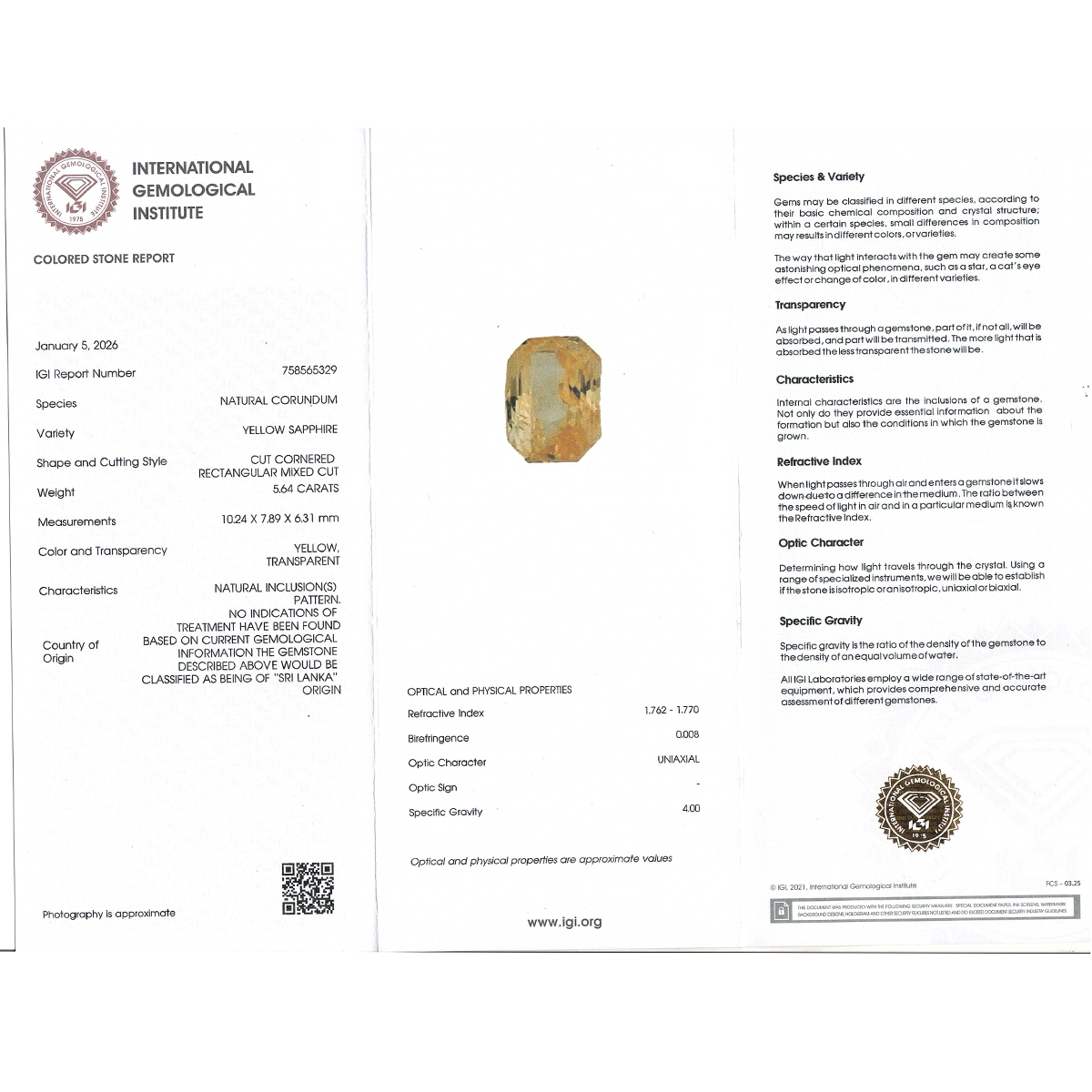 Buy This "AAA" Grade 10.24x7.89x6.31mm Step Cut Octagon Shape Natural Yellow Sapphire (Un-Treated) Loose Gemstone. You Will Receive 1 Pc. With a Total Weight of 5.64 Cts.. This Yellow Sapphire Stone is Originated From Sri Lanka and Masterfully Handcrafted by The Experienced Artisans of Jaipur (India).