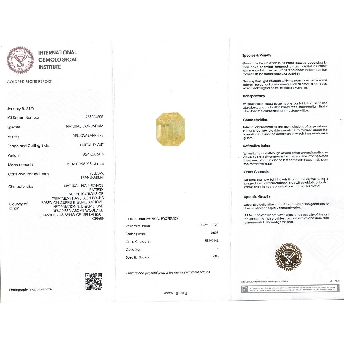 Buy This "AA" Grade 12.02X9.95X8.13mm Step Cut Octagon Shape Natural Yellow Sapphire (Un-Treated) Loose Gemstone. You Will Receive 1 Pc. With a Total Weight of 9.24 Cts.. This Yellow Sapphire Stone is Originated From Sri Lanka and Masterfully Handcrafted by The Experienced Artisans of Jaipur (India).