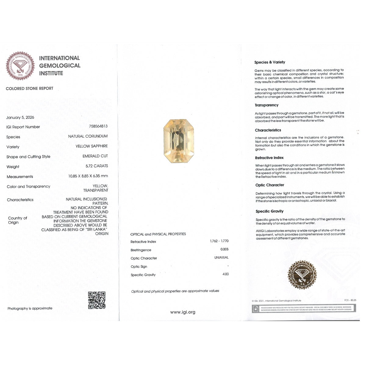 Buy This "AA+" Grade 10.85x8.85x6.35mm Step Cut Octagon Shape Natural Yellow Sapphire (Un-Treated) Loose Gemstone. You Will Receive 1 Pc. With a Total Weight of 5.72 Cts.. This Yellow Sapphire Stone is Originated From Sri Lanka and Masterfully Handcrafted by The Experienced Artisans of Jaipur (India).