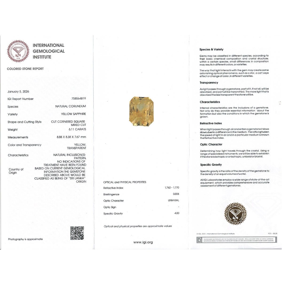 Buy This "AA" Grade 8.88x8.38x7.67mm Step Cut Octagon Shape Natural Yellow Sapphire (Un-Treated) Loose Gemstone. You Will Receive 1 Pc. With a Total Weight of 6.11 Cts.. This Yellow Sapphire Stone is Originated From Sri Lanka and Masterfully Handcrafted by The Experienced Artisans of Jaipur (India).