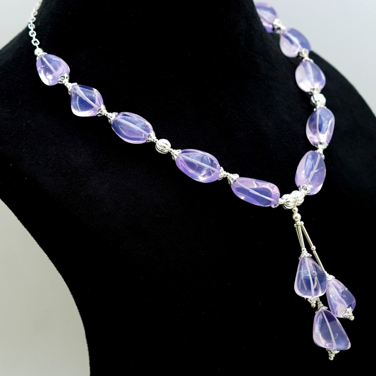 Lavender Quartz Smooth Nuggets Shape Gemstone Beads Necklace - This Vintage Style Smooth Nuggets Shape Gemstone Beads Necklace is Made With Rhodium Polished 925 Sterling Silver