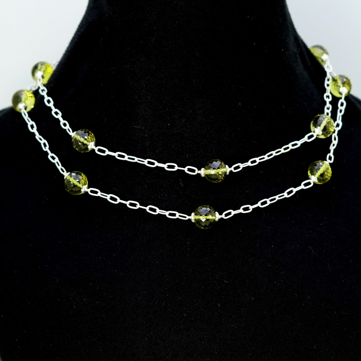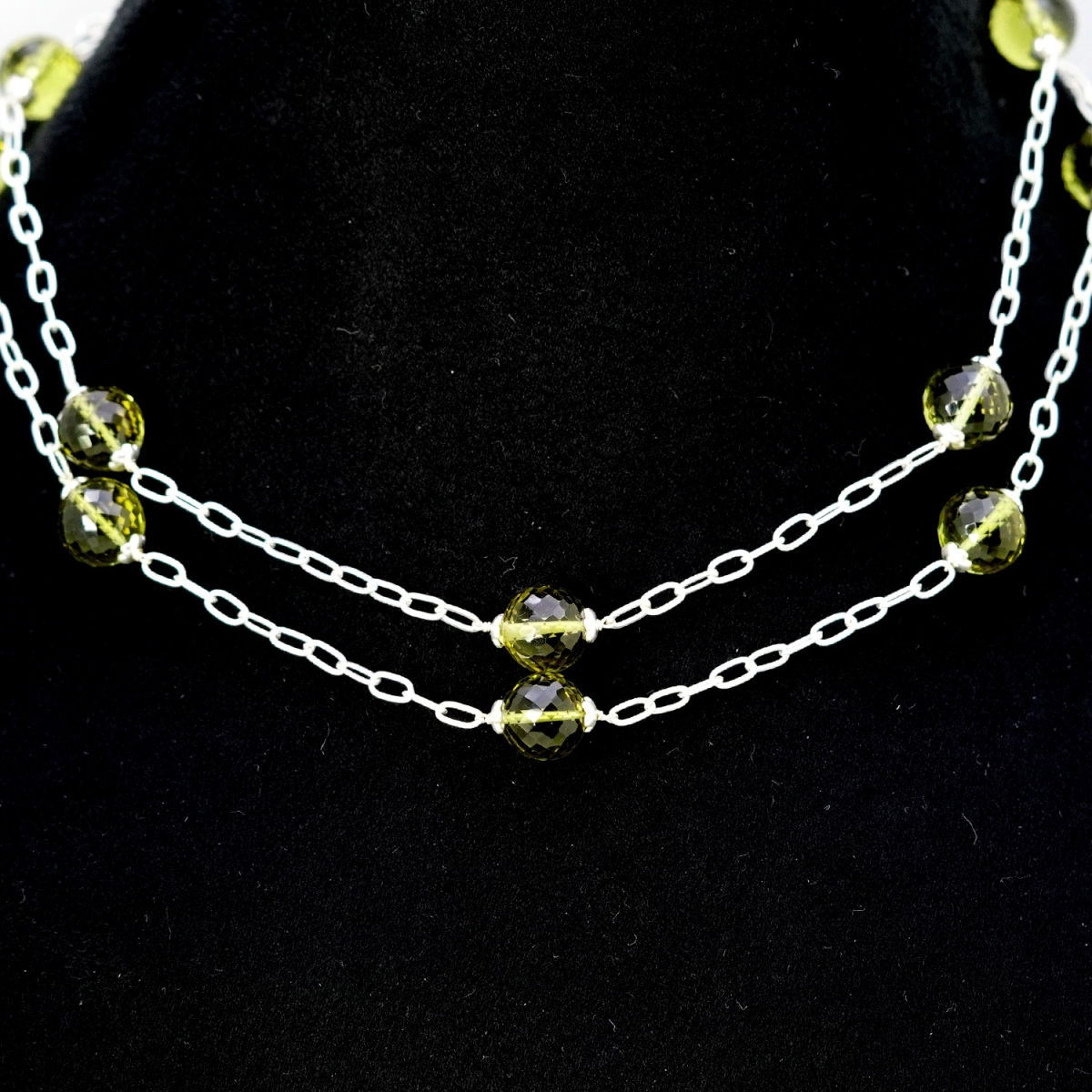 This Contemporary Style Olive Quartz Faceted Round Shape Gemstone Beads Necklace is Made With Rhodium Polished 925 Sterling Silver